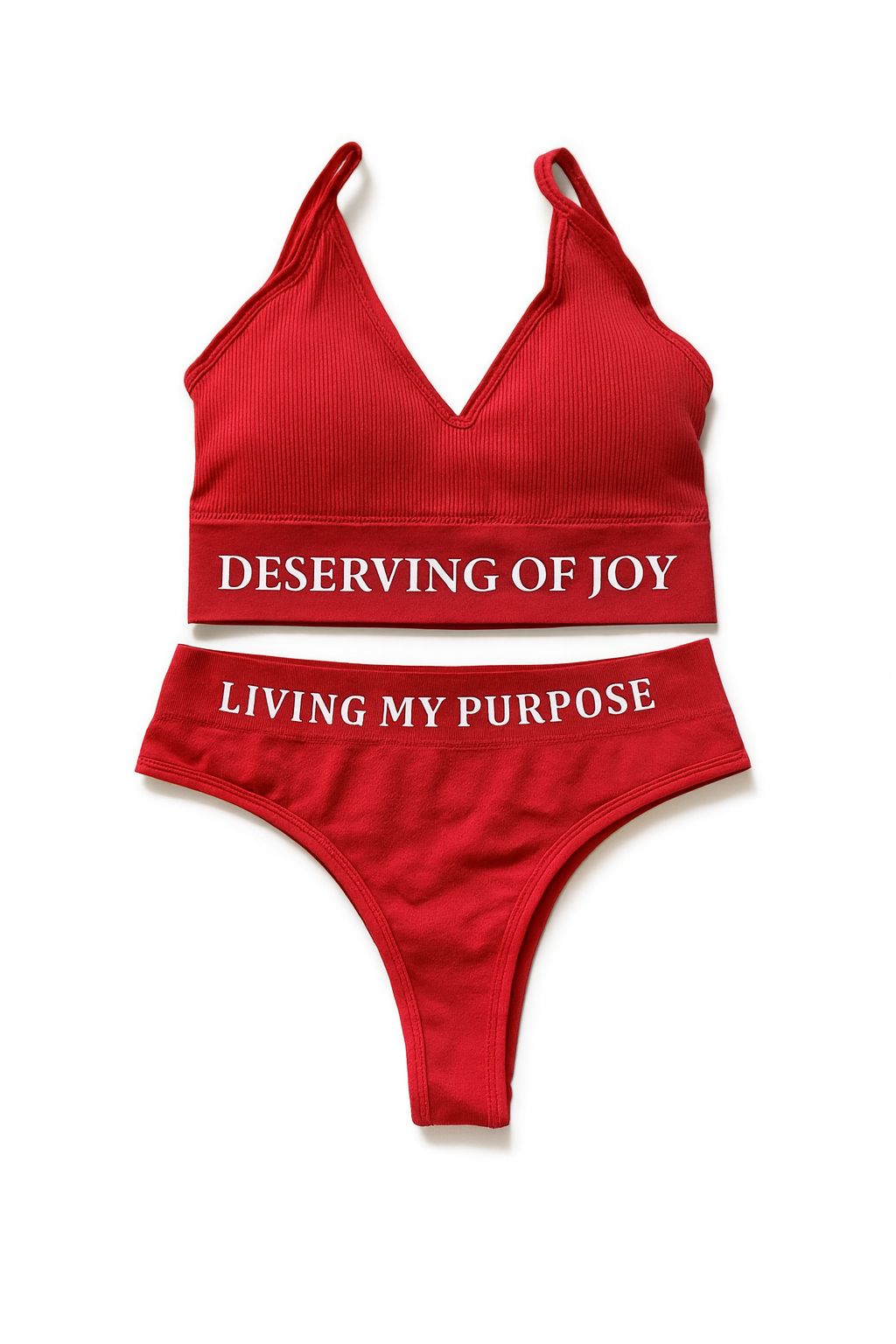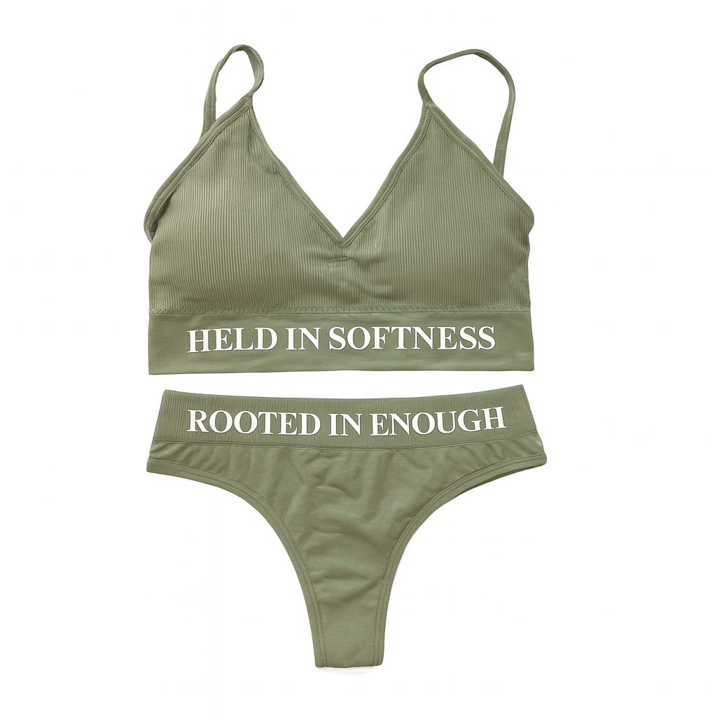 A grounded yet elevating lingerie set designed to remind you of your inner strength. The ribbed V-neck bralette offers a smooth, supportive pull-on fit, while the matching high-waisted thong hugs your shape with soft, seamless comfort.